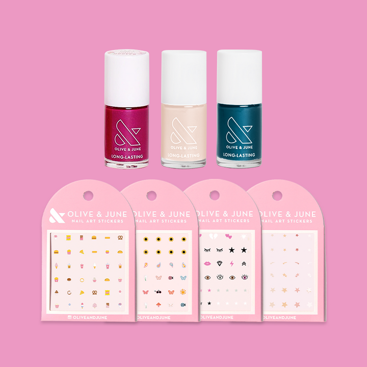 It’s a complete mani look in one! This bundle features a mix of nail art stickers plus three bestselling polish shades to create endless mani looks, your way.