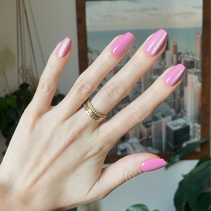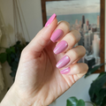 A shimmering pinky rose with a subtle velvet effect in a medium coffin shape.