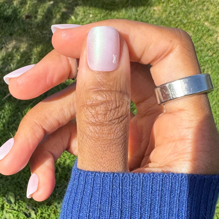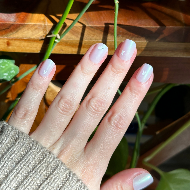 A shimmery lilac manicure with sweet bunnies in an extra short squoval shape.