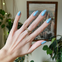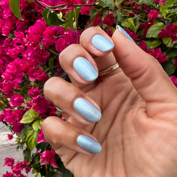 A shimmery sheer blue polish you’ll want to revisit again and again.