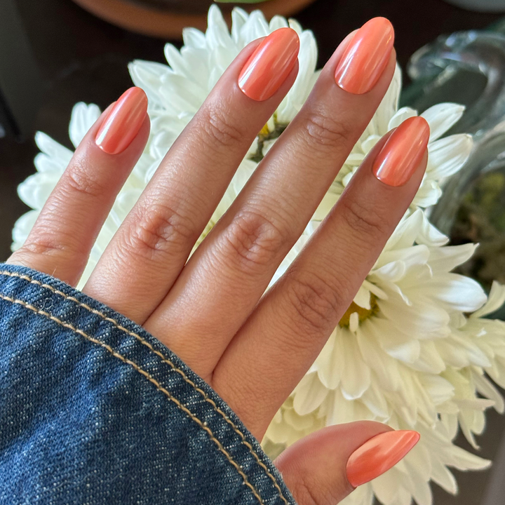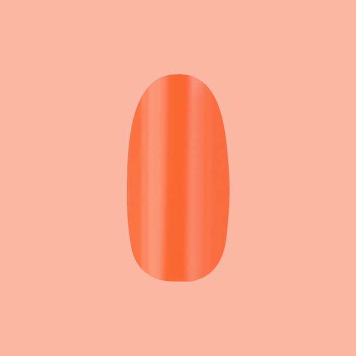 A bright tangerine orange mani topped with shimmery chrome in a medium oval shape.