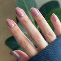 A warm pinky-brown neutral mani with a shimmering chrome outline in a short round shape.