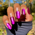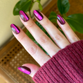 A deep mulberry mani with a chrome velvet finish in a medium oval shape.