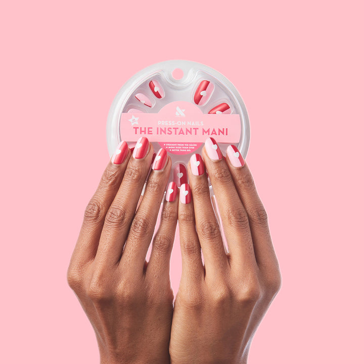 Equal parts bubbly and bright in a short round shape. Full heart eyes for this mani.