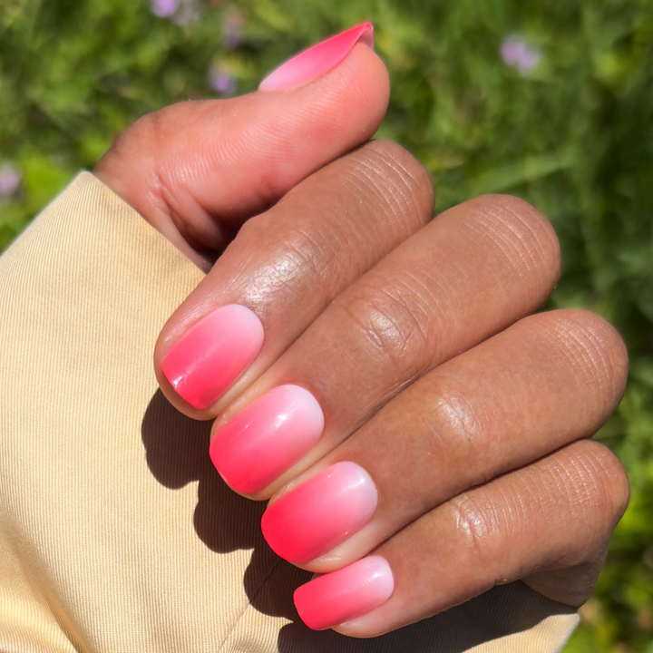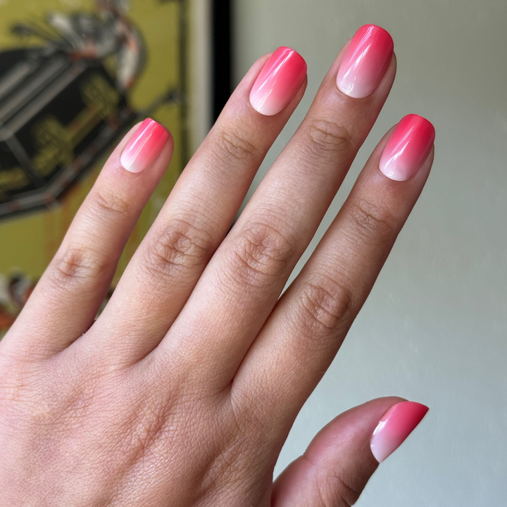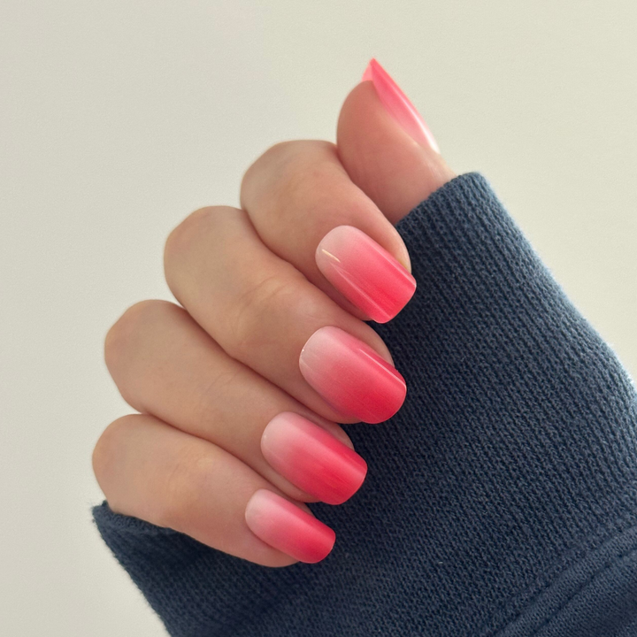 A berry pink sheer gradient effect in a short squoval shape.