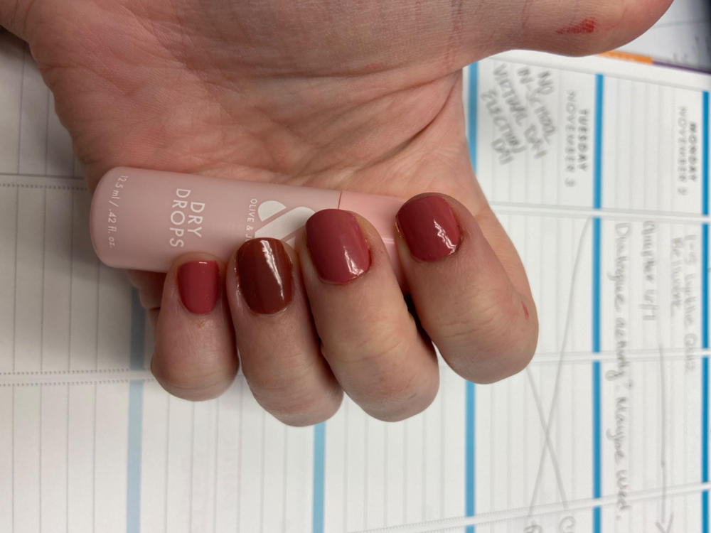 I wanted to like this product but I just can't. First of all, there were not any directions when it arrived. Not that it is super complicated, but I wanted to be able to confirm was I supposed to do drops after each coat? Only after all polish coats but before topcoat? After topcoat? Eventually figured out that it is after topcoat, so it really doesn't save that much time. They do their job, but it is so messy. Oil leaked all over my desk and damaged it. I was only using a single drop on each nail but everything instantly became oily. See attached photos for the damage on my desk (sorry it was difficult to get a good photo of this). I suppose if you make sure you have a towel underneath and understand that this is only to save time after the topcoat then maybe it will work for you. I'm such a big fan of Olive and June polish in general but was very disappointed in this product.