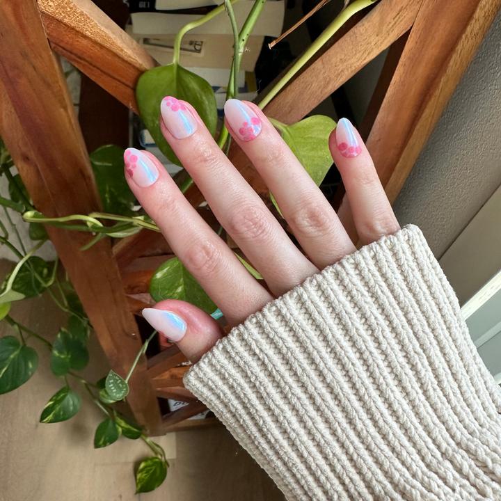 A shimmery iridescent mani with airbrushed fuschia blooms in a short almond shape.