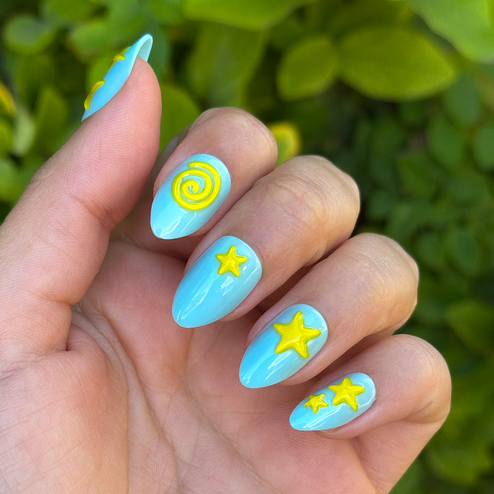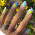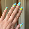 Feel the fun with this playful blue and slime lime green mani in a medium almond shape.