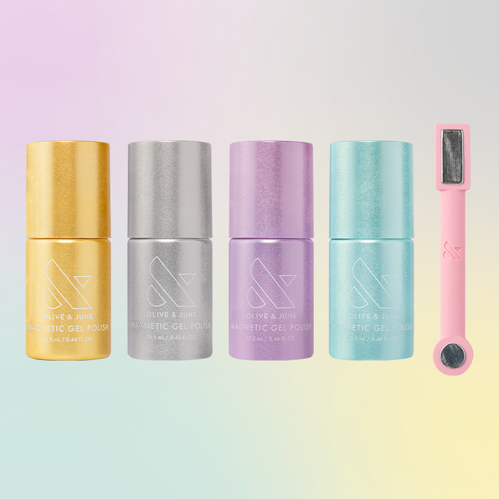 A quad of new magnetic gel polishes for magical special effect manis. Includes our magnetic wand to activate the effect.