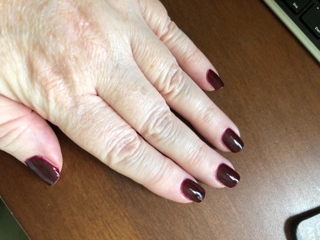 Looks super dark in the bottle, but goes on as a lovely true burgundy that is perfect for fall and winter.