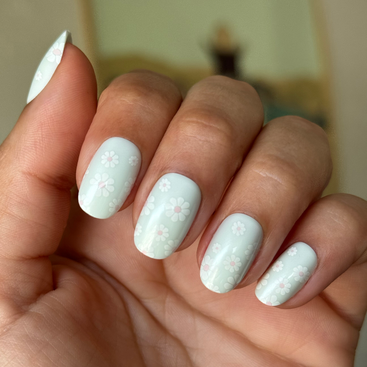 A pastel chrome teal mani topped with delicate daisies in a short round shape.